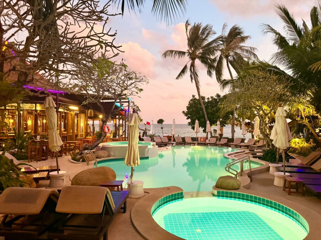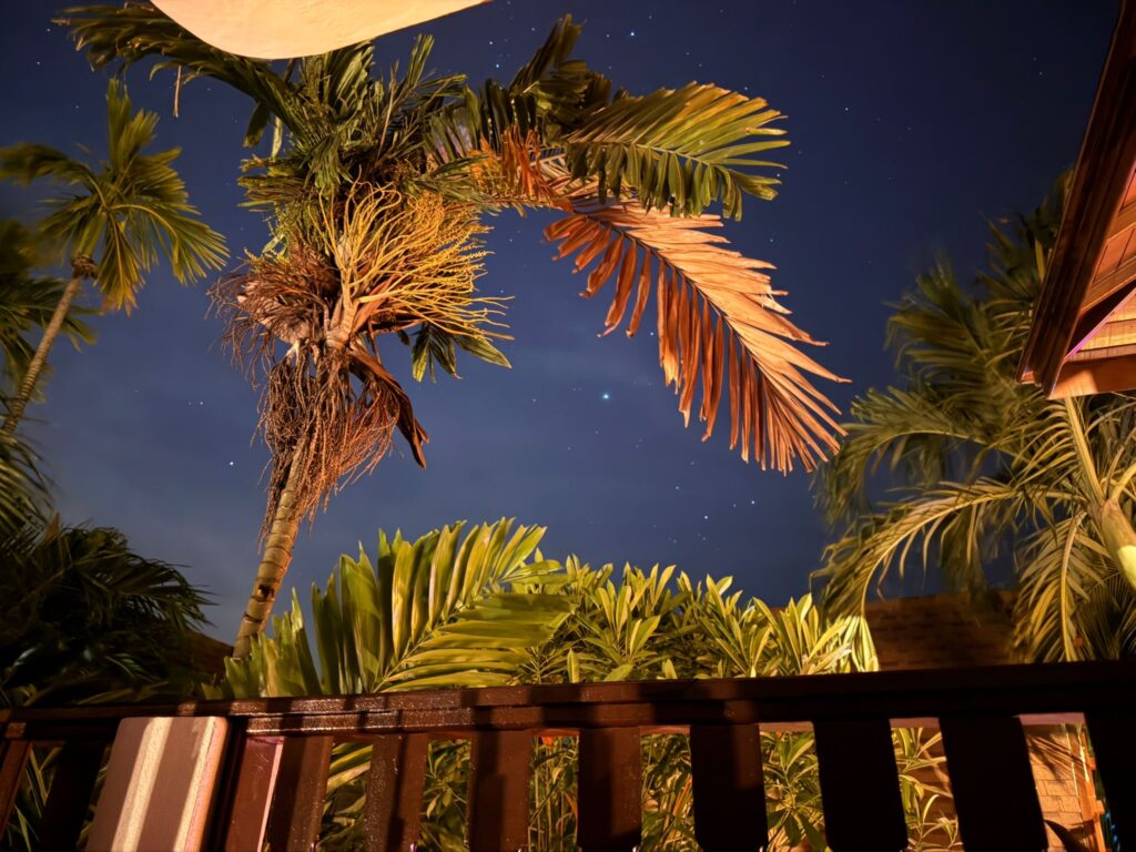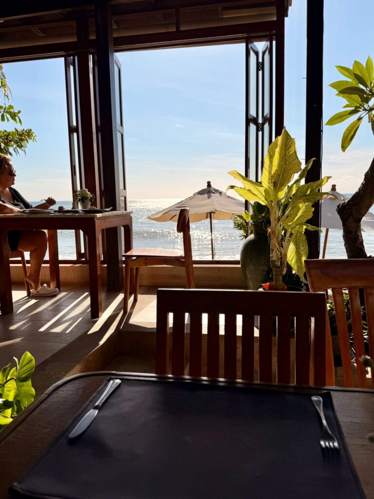 Jetzt sind wir im ersten Stock Richtung Strand untergebracht. Alles fühlt sich luftiger und frischer an als zuvor im Erdgeschoss zum Innenhof, und durch die niedrigen Villen vor uns haben wir deutlich mehr Privatsphäre. Das erneute Packen war es definitiv wert.