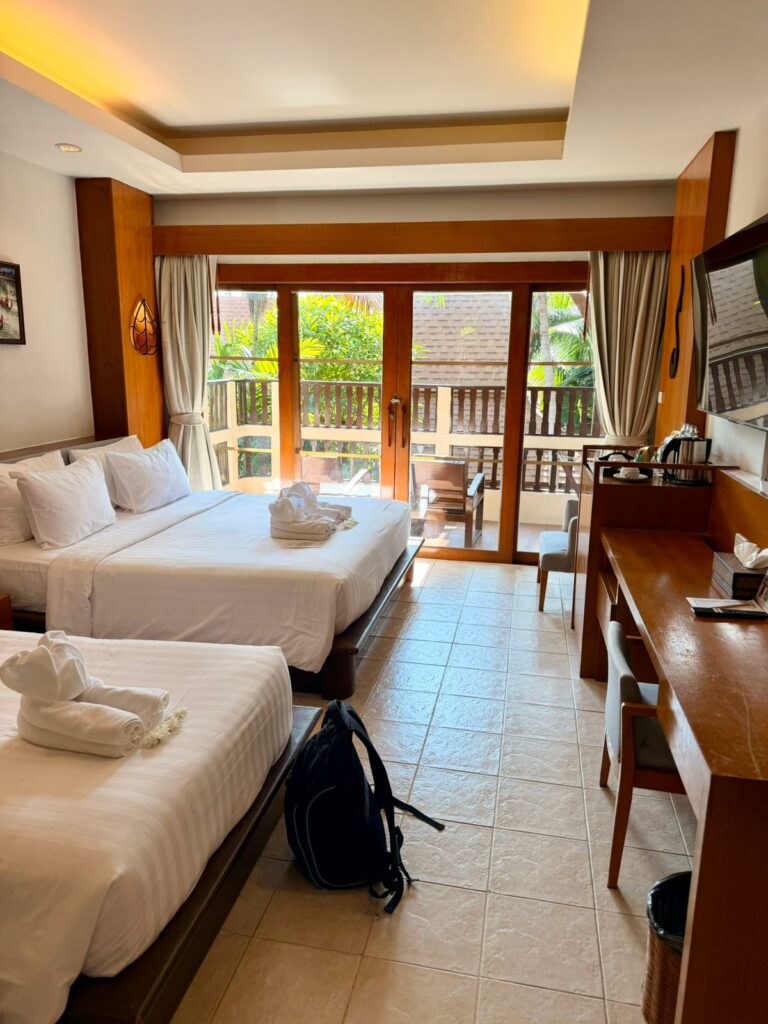 Unseren ersten ganzen Inseltag starteten wir ganz entspannt und schliefen bis 08:00. Danach hieß es allerdings noch einmal Koffer packen. Direkt vor unserer Zimmertür wird gerade ein Lift eingebaut, was rund um die Mittagszeit mit ordentlich Lärm verbunden ist. Deshalb baten wir um ein anderes Zimmer – und das hat sich mehr als gelohnt.