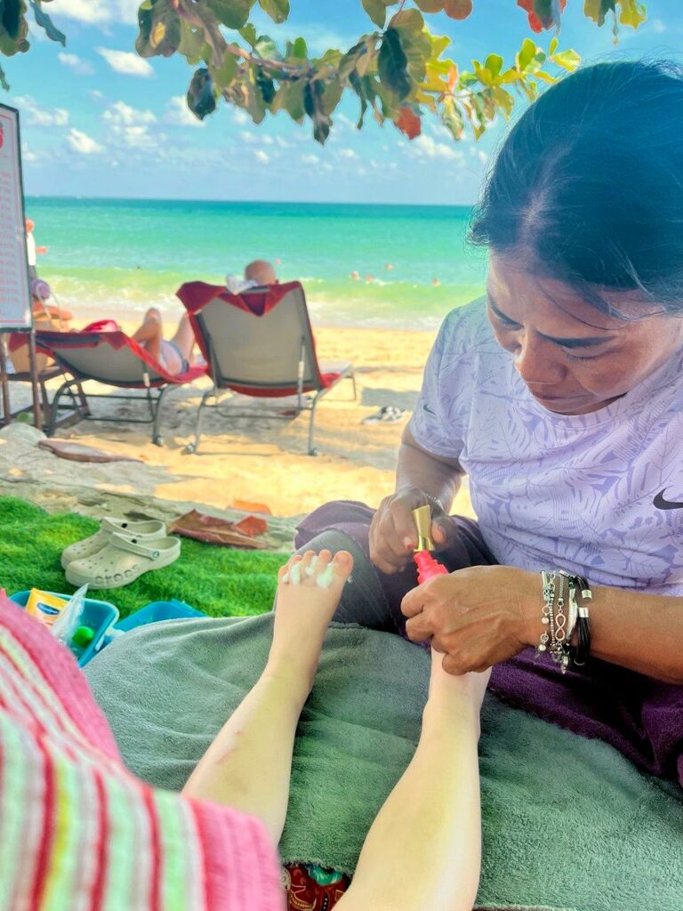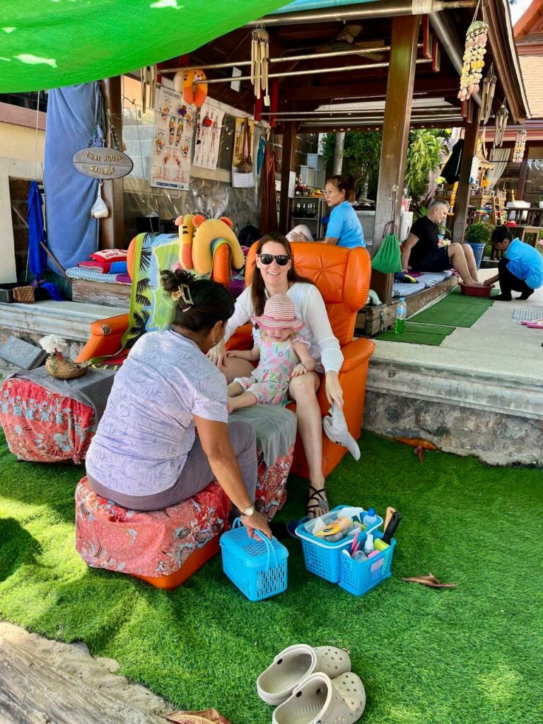 Zurück im Hotel durfte Emelie sich die Nägel lackieren lassen, im Sessel mit Blick aufs Meer. Glitzerpink, natürlich. Danach ging es gefühlt ewig ins Meer. Die Wellen, vor denen sie gestern noch großen Respekt hatte, waren heute das absolute Highlight. Mit Schwimmweste und an Toms Hand ging es immer wieder rauf und runter – und wir genossen es gleich mit.