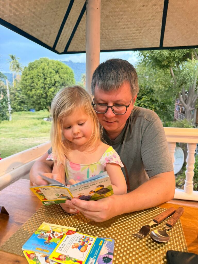 Nach einer eher wenig erfolgreichen Mittagsrast ging es ins Paper Moon Restaurant. Cashewnut Chicken, ein scharfes Green Curry für Tom und ein ausgezeichneter Sticky Rice with Mango später machten wir uns sehr zufrieden auf den Heimweg. Für Conny war es der erste Sticky Rice auf dieser Reise – aber sicher nicht der letzte. Emelie verabschiedete sich dort noch mit einem sehr ehrlichen Kompliment an die Besitzer: „Euer Klo riecht super geil.“ Conny konnte sich ihren Lacher kaum verkneifen. Sprachlich ist Emelie generell voll dabei: Sie begrüßt mit „Sawadee-ka“, bedankt sich mit „Khob khun ka“, mischt aber auch fröhlich ein „Thank you“ hinein. Leider hat sie wohl irgendwo auch „Du dumme Ente“ aufgeschnappt – das hören wir jetzt ebenfalls öfter.