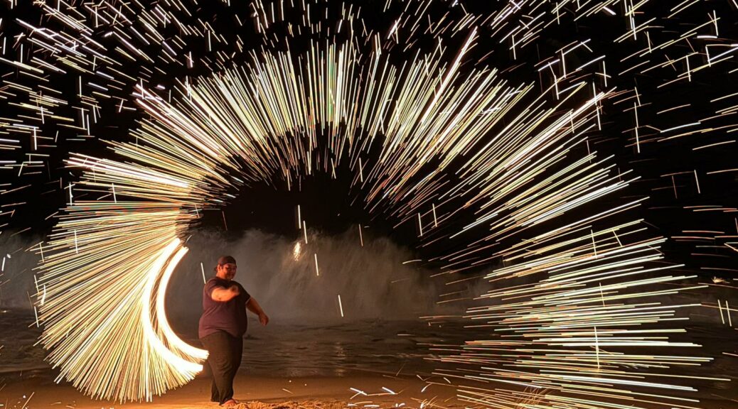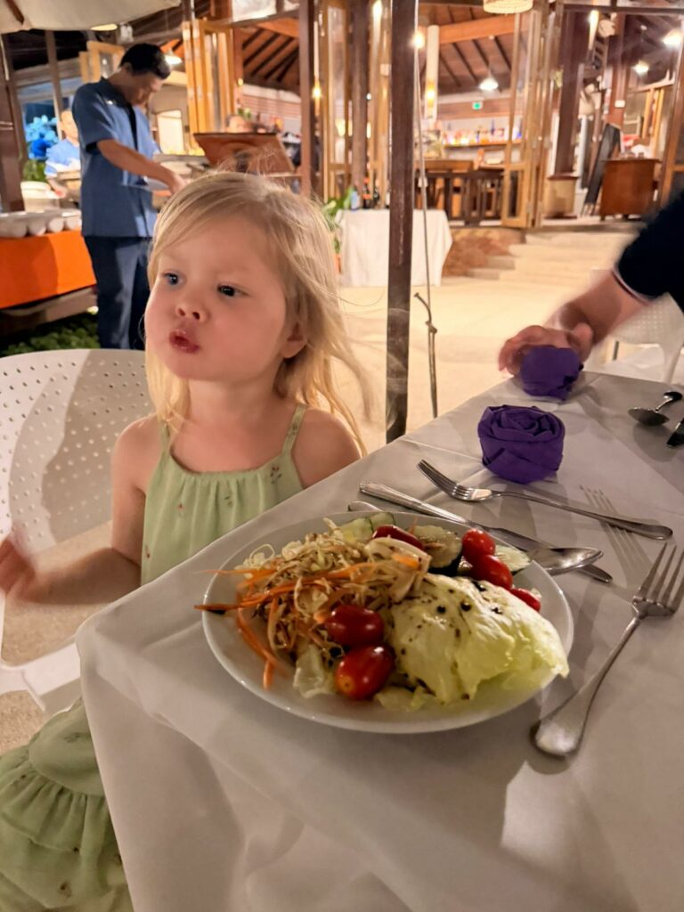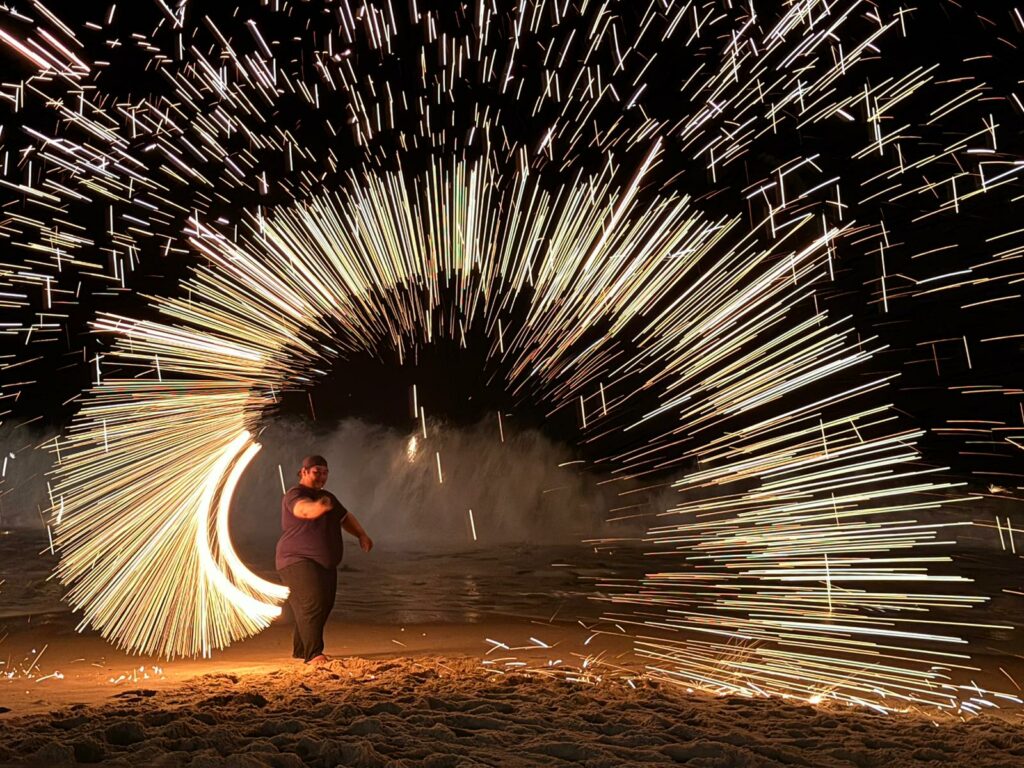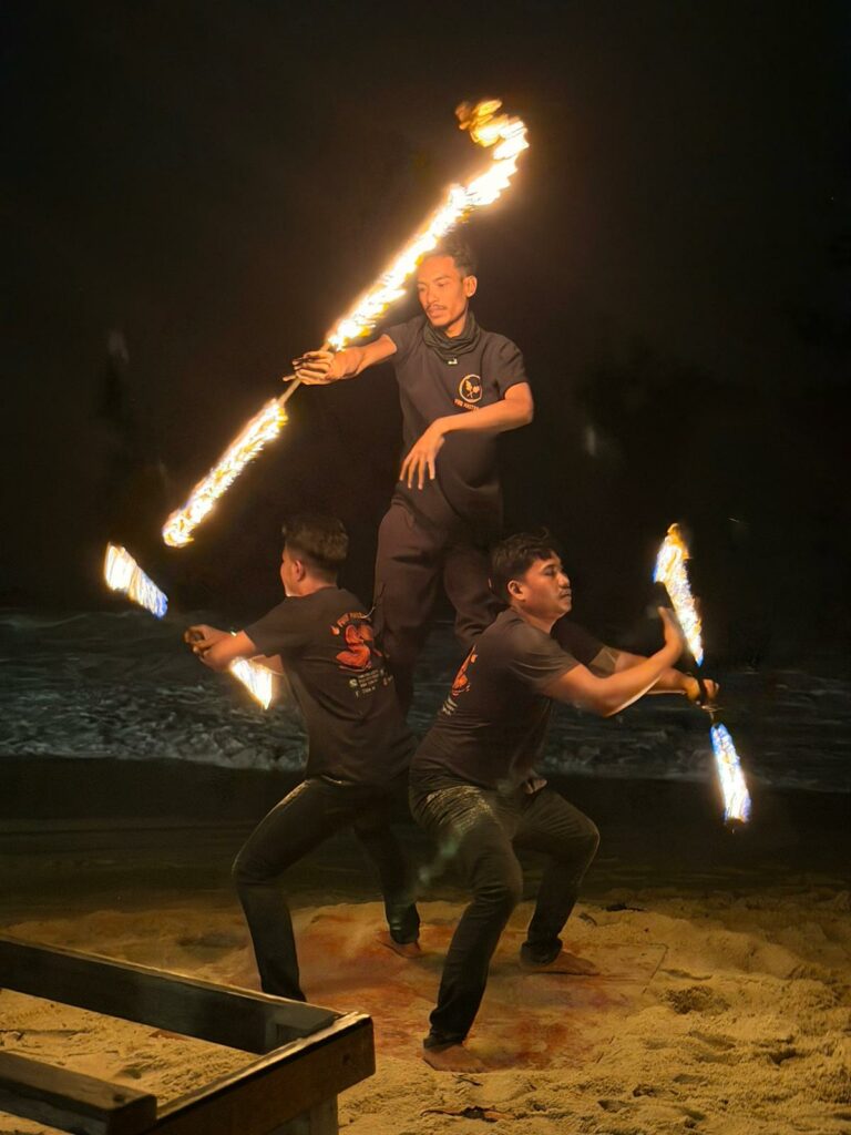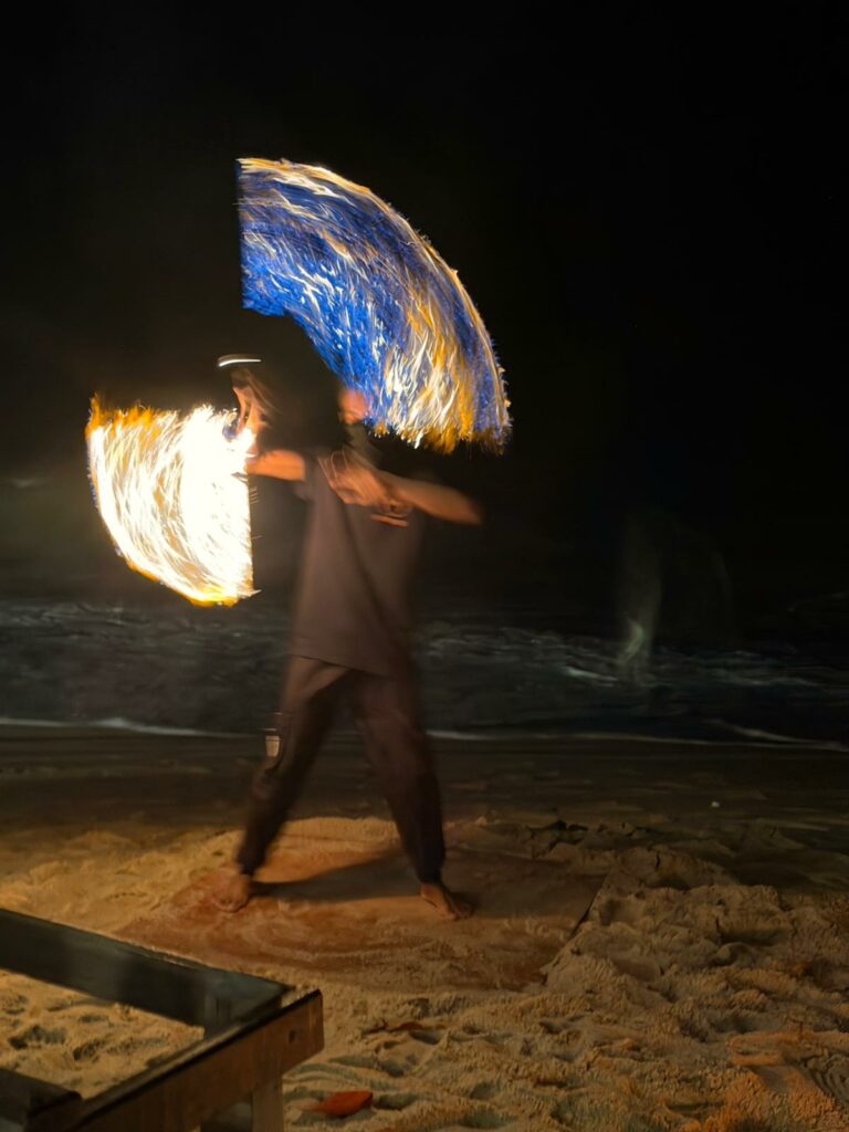 Am Abend wurde es dann noch einmal richtig spannend. Emelie hatte schon den ganzen Tag der angekündigten Feuershow entgegengefiebert und war gleichzeitig ein bisschen nervös, weil sie dem Feuer nicht zu nahe kommen wollte. Nach einem richtig guten Barbecue in unserem Hotelrestaurant ging es um 20:00 los. Vier junge Männer zeigten direkt am Strand vor unserem Hotel eine beeindruckende Feuershow. Emelie verfolgte alles aus der ersten Reihe und davon wird sie bestimmt noch lange erzählen.