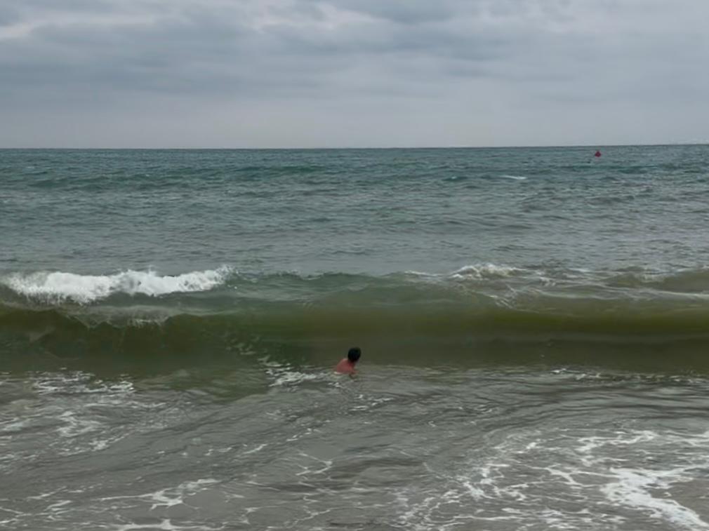 Danach gingen wir an den Strand, wo uns diesmal hohe Wellen erwarteten. Tom war der erste Mutige und stürzte sich in die Fluten, um sich an den brechenden Wellen zu versuchen – ohne Bodyboard gar nicht so einfach. Nachdem ihn eine Welle ordentlich erwischt hatte, tauschten wir und Conny ging ins Wasser, während Tom mit Emelie am Strand blieb. Conny genoss die größeren Wellen weiter draußen sehr und abgesehen von den flacheren Passagen beim Rein- und Rausgehen war alles richtig angenehm. Das Wasser hatte etwa 28 Grad, die Luft rund 27 Grad. Wolken und Sonne wechselten sich ab, dazu ein leichter Wind. Perfektes Wetter für Strand und Pool.