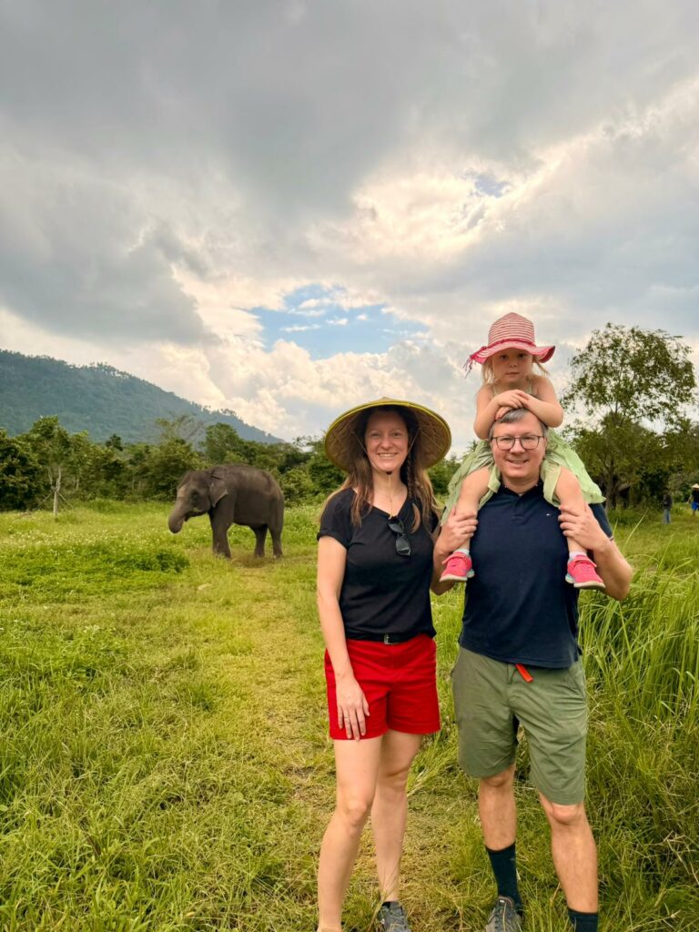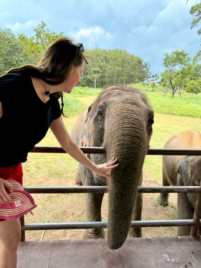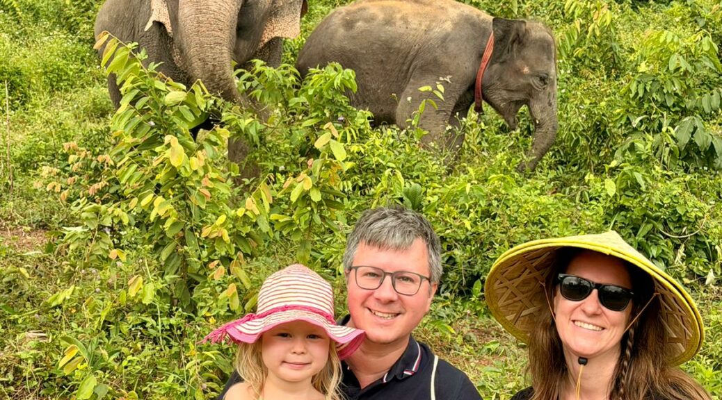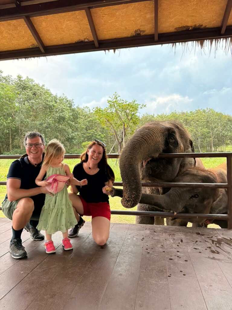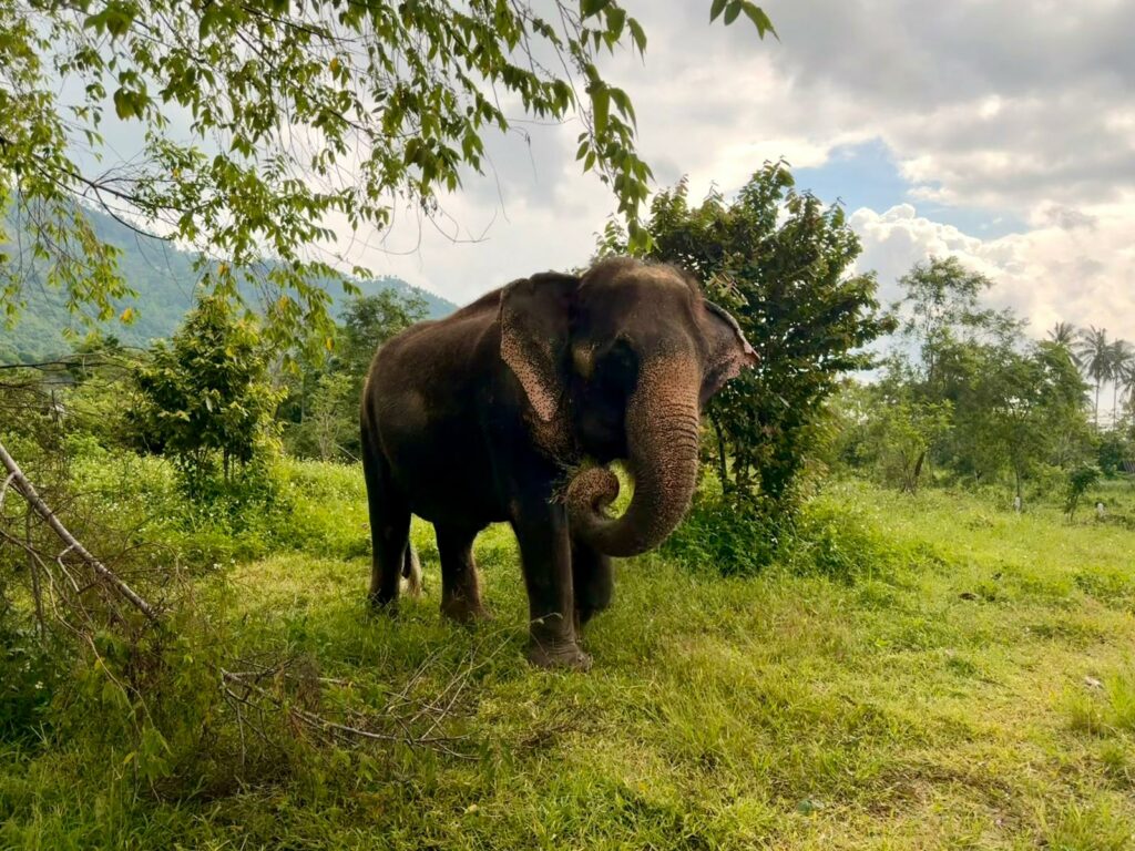 Nach einer kurzen Fahrt kamen wir im Samui Elephant Home an, das vor einigen Jahren gegründet wurde, um geretteten Elefanten ein sicheres und respektvolles Zuhause zu geben. Anders als in dem Sanctuary, in dem Conny und Tom vor 17 Jahren noch auf Elefanten reiten durften, wird hier konsequent auf einen ethischen Umgang geachtet. Keine Shows, kein Reiten, dafür Ruhe, Abstand und viel Respekt. Heute leben hier neun Elefanten.