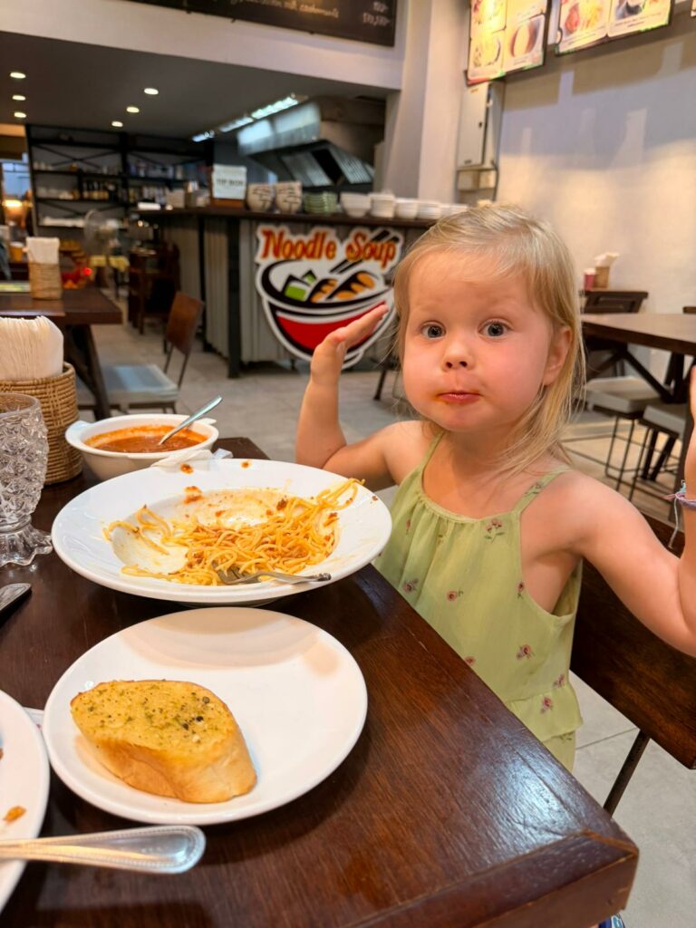 Zu Mittag kehrten wir wieder bei einem unserer beiden Lieblings-Thailokal um die Ecke ein. Emelie entschied sich ganz bewusst für Fried Rice, obwohl sie wusste, dass es dort auch Pommes gibt. Scheint als würde ihr die thailändische Küche wirklich schmecken!