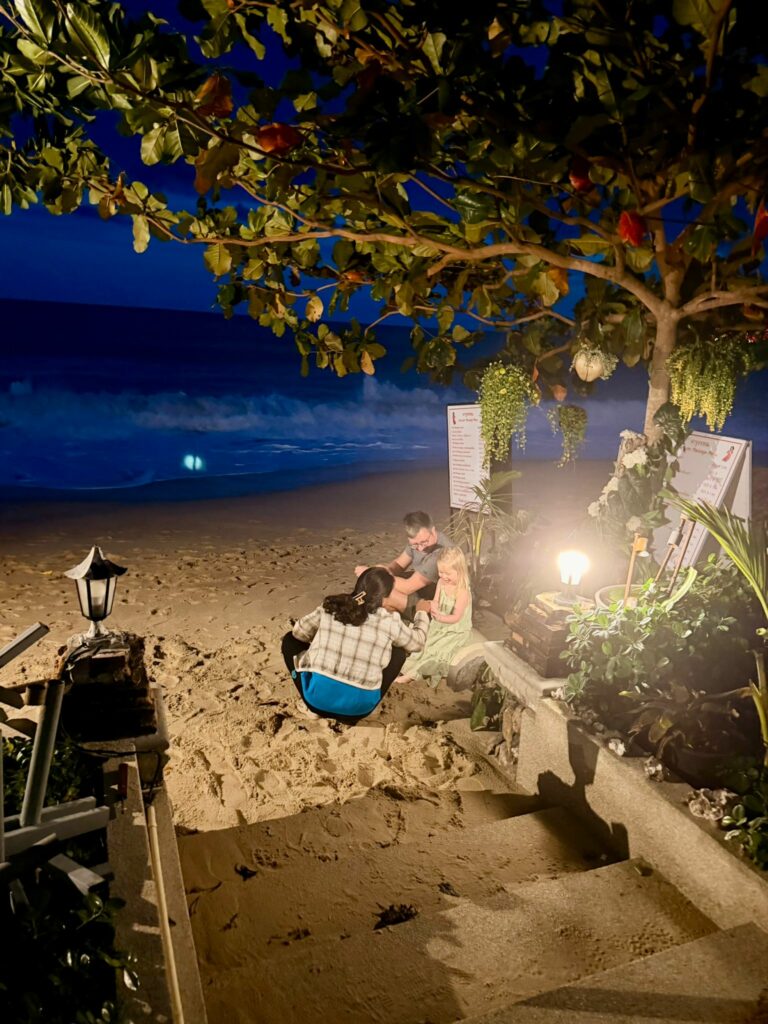 Bevor wir zurück aufs Zimmer gingen, machten wir noch einen Abstecher zum Strand. Dort trafen wir die Besitzerin des Massagepavillons, während ihre Kolleginnen noch fleißig arbeiteten. Sie hat Emelie sofort eingewickelt in ein spannendes Program aus Spiel und tanzen. Die beiden sind schon richtig gute Freundinnen. Emelie bekommt dort regelmäßig Bananen, und heute brachte sie ihr im Gegenzug Schoko-Koalas vorbei. Morgen darf sie zu einer Massage vorbei kommen 😉 So süß.