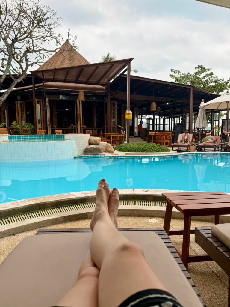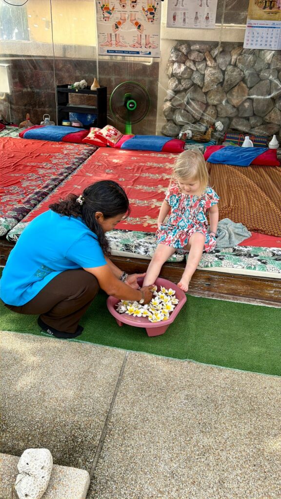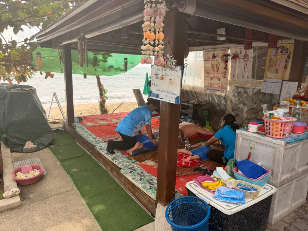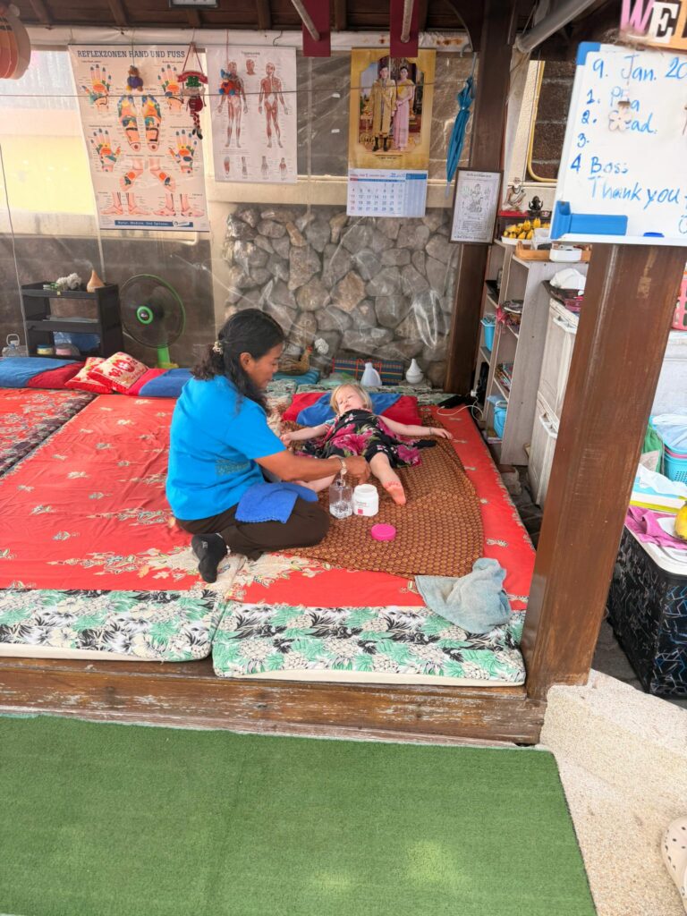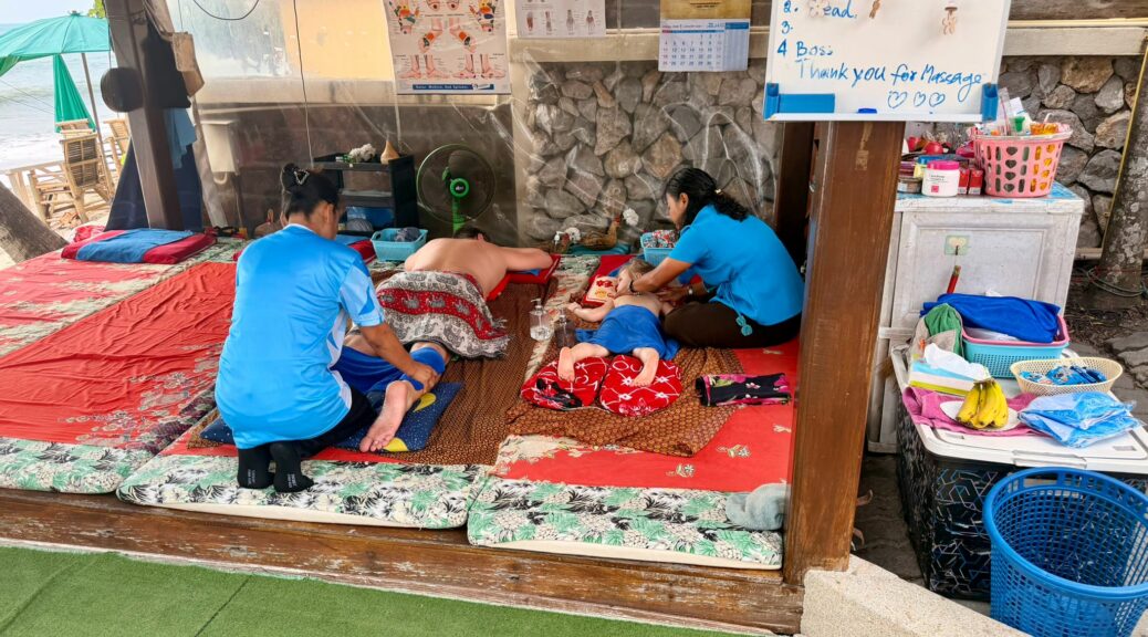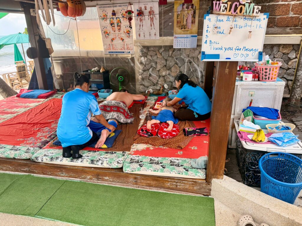 Heute war Strandtag angesagt. Nach dem Ausflug gestern und der Weiterreise nach Koh Phangan morgen ist ein ruhigerer Tag insbesondere für Emelie willkommen. Nach dem Frühstück besuchte Emelie ihre Lieblingsmasseurin, die ihr gleich eine Ölmassage anbot.