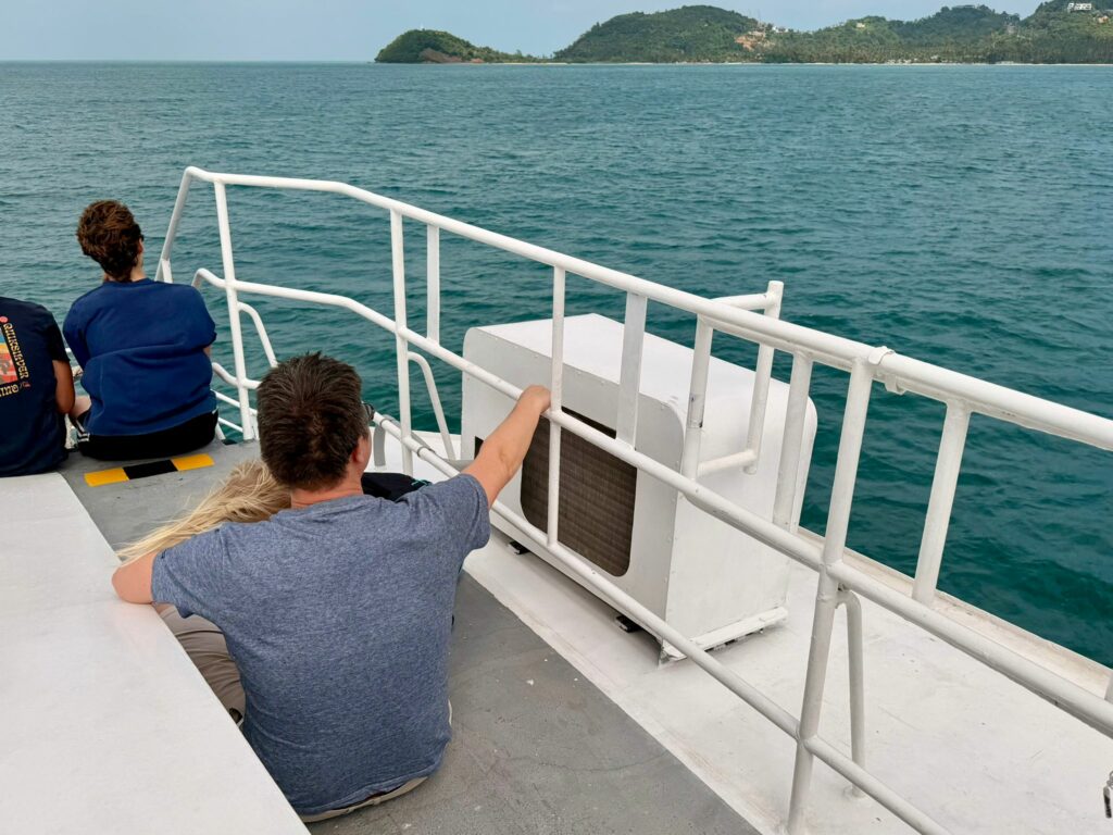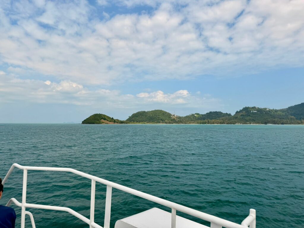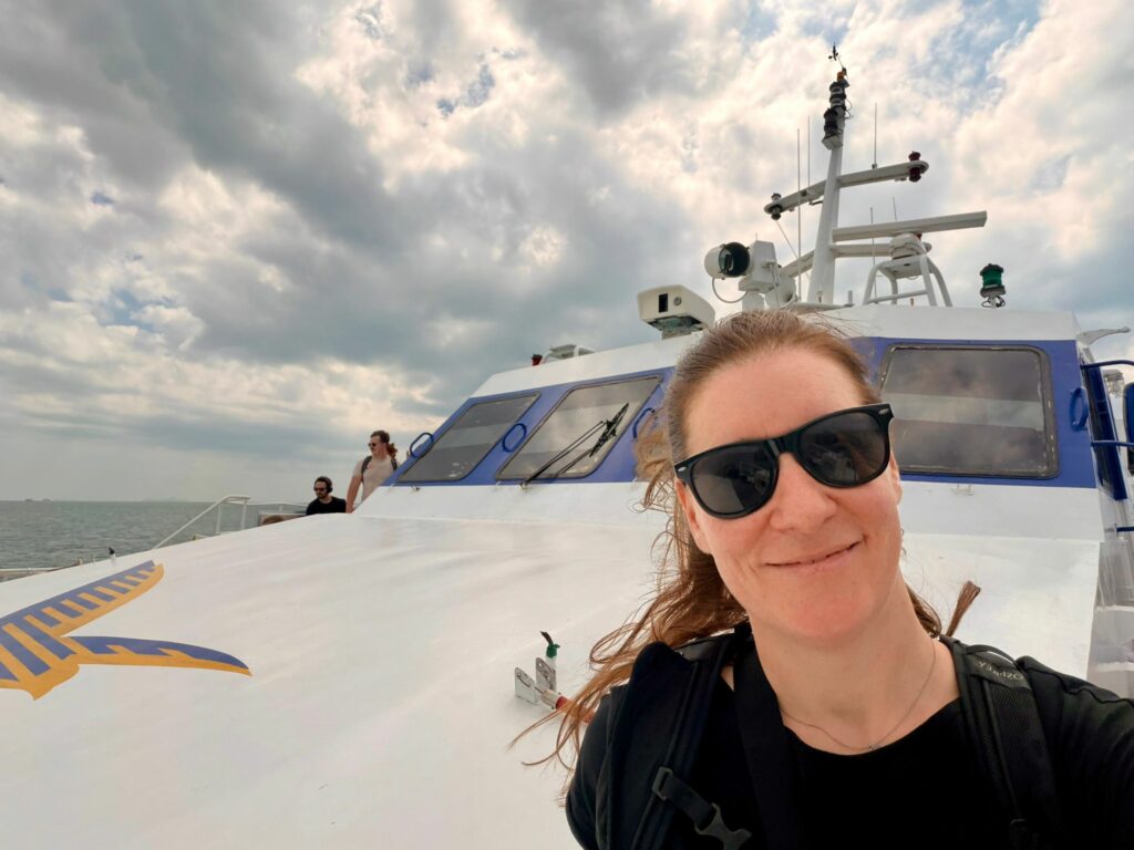 Während Emelie und Tom am Vormittag noch einmal den Pool genossen, durfte Conny in Ruhe packen. So waren wir alle pünktlich und entspannt für den Pick-up um 11:00 bereit. Dieser brachte uns zur Fähre, einem Hochgeschwindigkeitskatamaran für einige hundert Passagiere. Den ersten Teil der Überfahrt verbrachten wir nahe am Bug, doch als die Wellen für Emelie etwas zu wild wurden, wechselten wir in den ruhigeren Bereich am Heck.