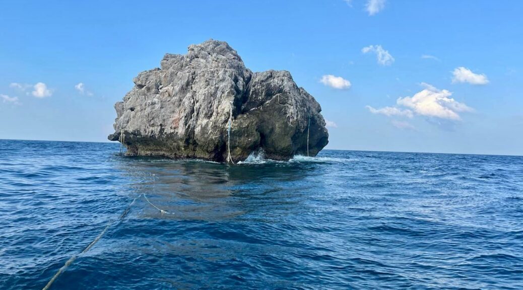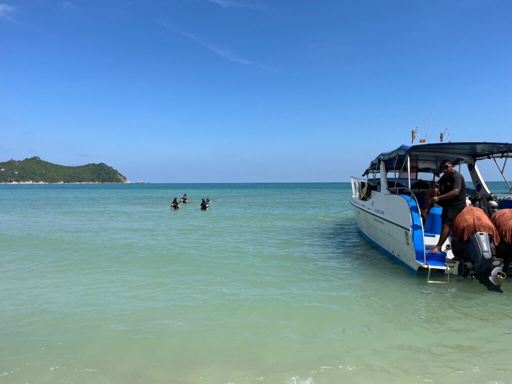 Nach einer kurzen Pause ging es direkt weiter. Ein paar letzte Tipps von Lee, eine Sicherheitseinweisung, und schon waren wir mit dem Boot unterwegs Richtung Sail Rock – einem Felsen mitten im Meer. Da war Conny sehr froh, schon frühzeitig etwas gegen Seekrankheit genommen zu haben, denn die Wellen hatten es trotz moderater Höhe ordentlich in sich.