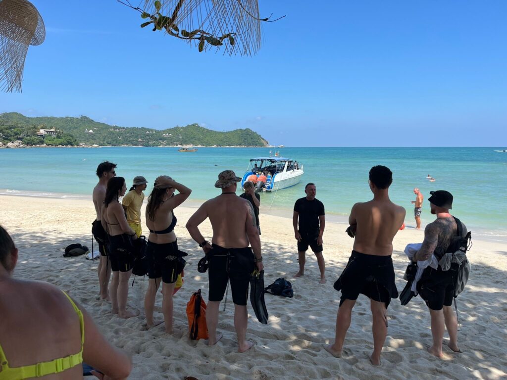 Noch einmal wurde gezeigt, wie das Equipment zusammengebaut wird, worauf man beim Buddy-Check achten muss und was zu tun ist, wenn die Maske voll Wasser läuft oder der Atemregler verloren geht. Im seichten Wasser wurde alles in Ruhe geübt – inklusive Tarierung. Es klappte richtig gut, und Conny hatte sogar Publikum: Emelie und Tom, gemeinsam mit Katharina und Christina, verfolgten alles aufmerksam vom Strand aus.