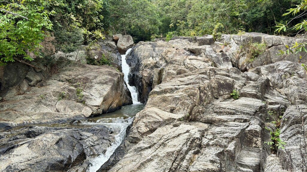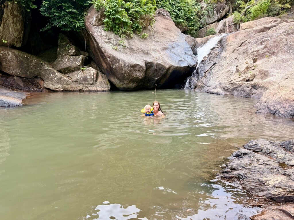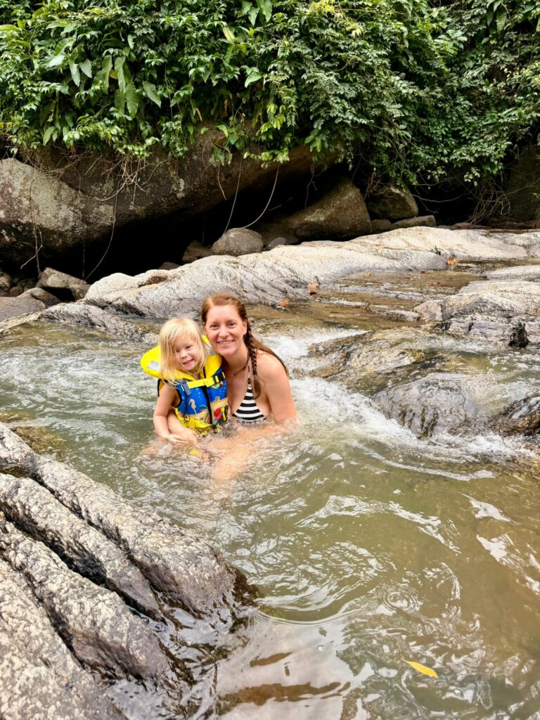 Unser erster Stopp war der Pho Darng Waterfall. Nach einem kurzen, etwa fünfminütigen Spaziergang erreichten wir den Wasserfall. Unser Guide zeigte uns zuerst einen kleineren Pool am oberen Ende, doch Emelie wollte lieber gleich den großen Pool ausprobieren. Mit Schwimmweste wagte Conny und sie sich hinein und waren begeistert, als sie in der Mitte einen Felsen entdeckte, auf dem sie stehen konnten.