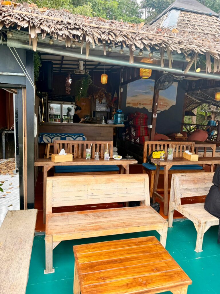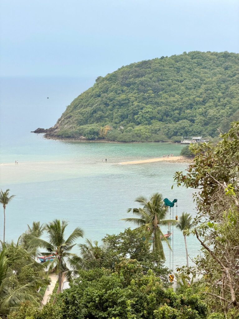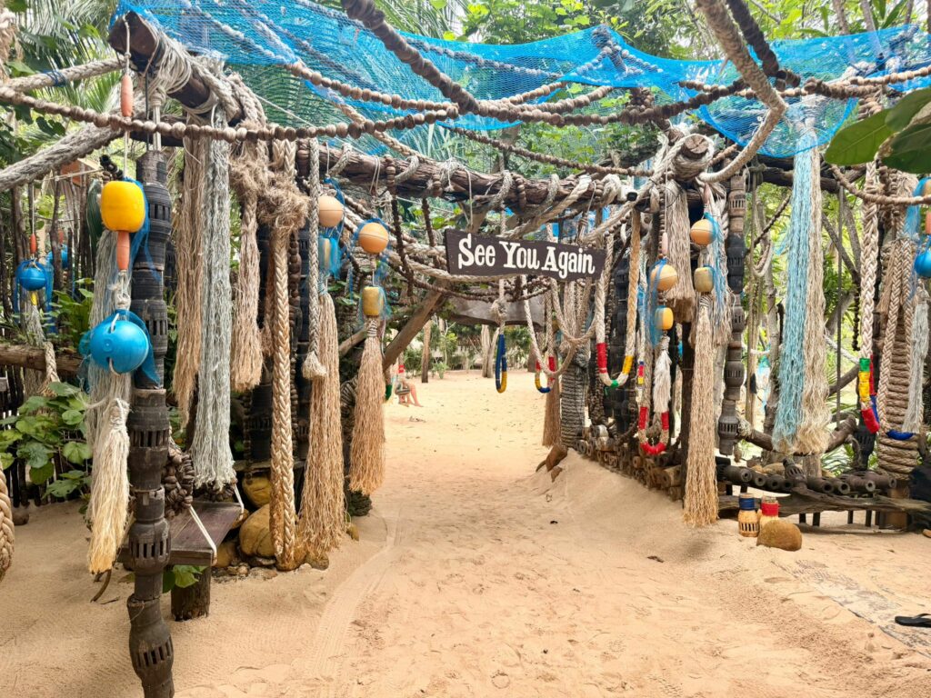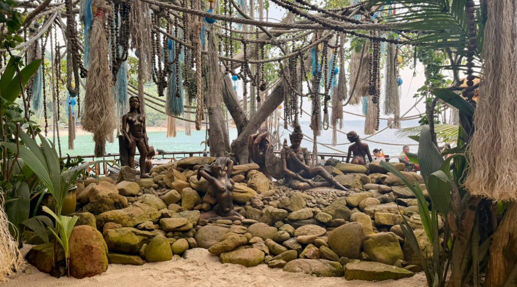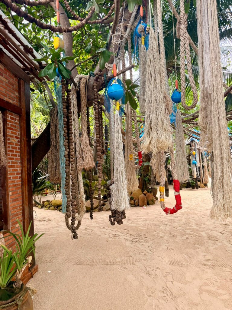 Weiter ging es zum Secret Beach. Ein wirklich schöner Strand, aber nachdem wir von unserem eigenen Strand sehr verwöhnt waren, beschlossen wir nach kurzem Entspannen, uns etwas zu essen zu suchen. Empfohlen wurde uns das Koh Raham – ein Restaurant direkt an der Bucht, das mit unglaublich viel Liebe zum Detail gestaltet ist. Wir waren sofort begeistert: Hängematten fast über dem Meer, kleine Zugänge ins Wasser, in denen man Fische beobachten konnte, unzählige Schaukeln und Statuen. Ein fast magischer Ort.