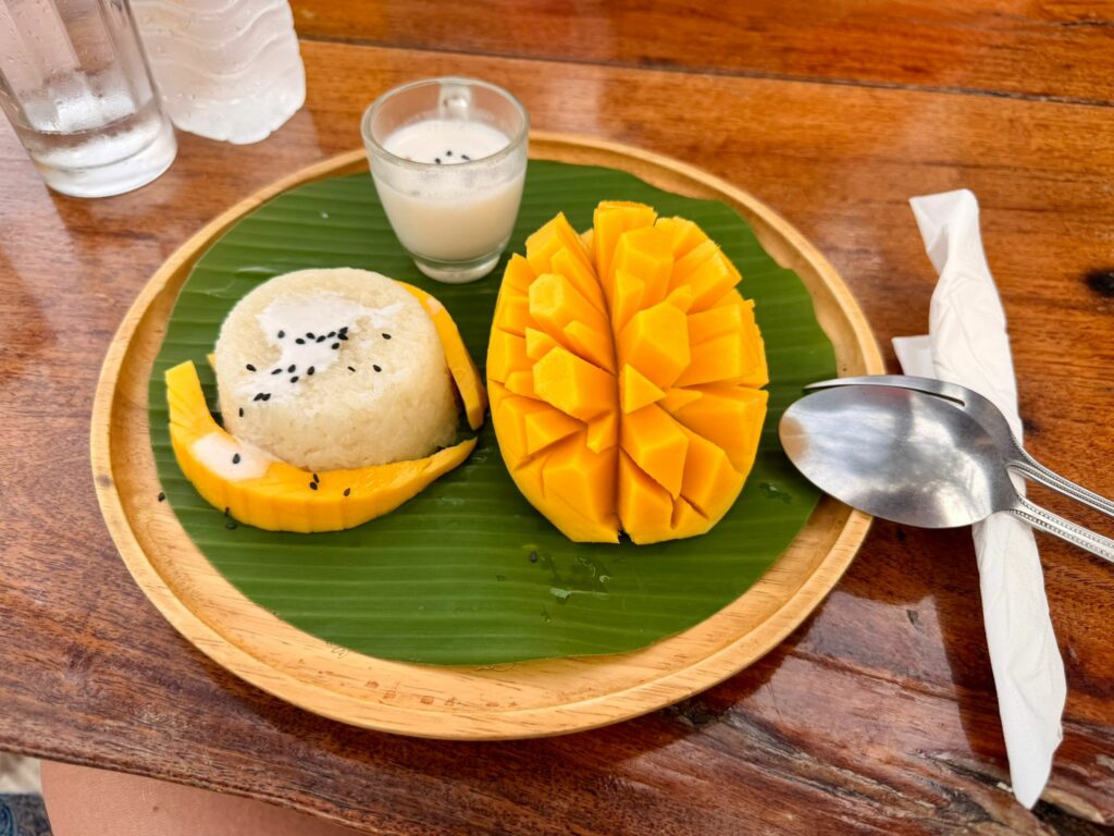 Am Heimweg schlief Emelie sofort ein und war im Resort wieder fit für den Nachtisch: Schokoeis für Emelie, Sticky Rice with Mango für Conny. Am Abend gab es dann noch eine gegrillte Kartoffel für Emelie und Conny, Tom teilte sich mit ihnen eine Frühlingsrolle. Gefühlt hatte der Tag ab Mittag ohnehin fast nur noch aus Essen bestanden – aber auf die bestmögliche Art.