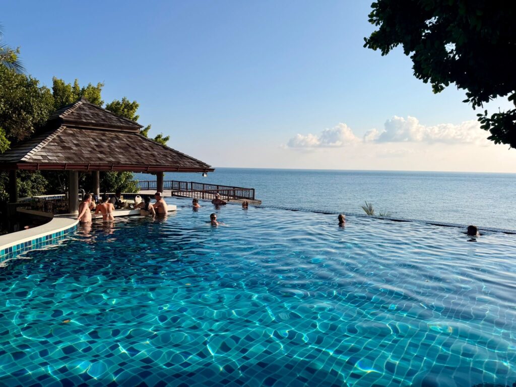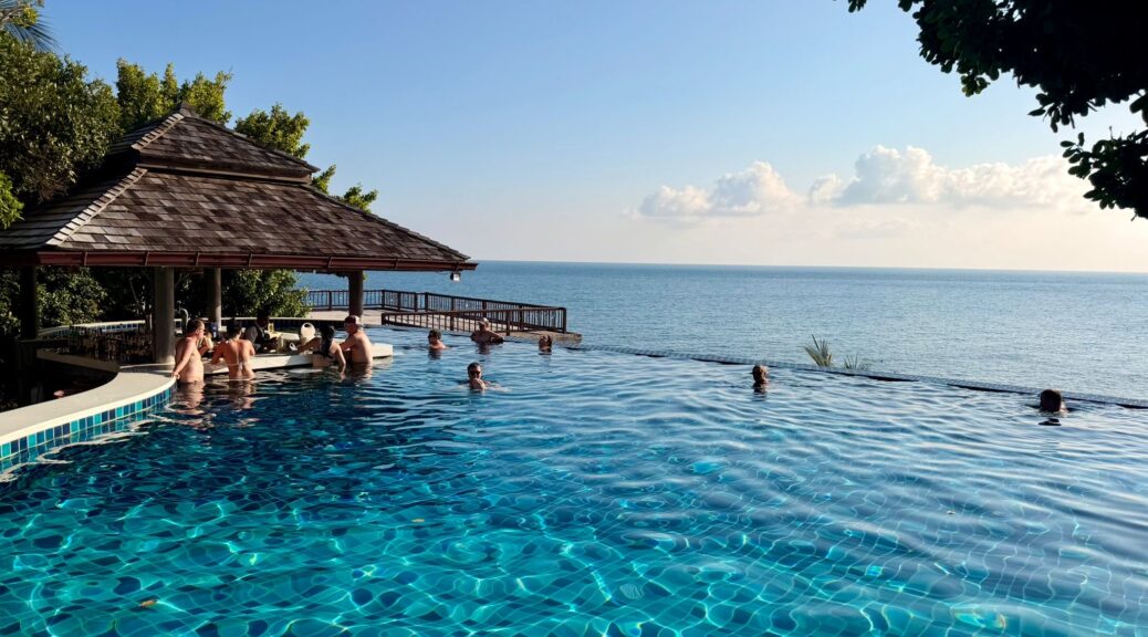 Tom und Emelie haben auch keine Zeit verloren und sind sofort Richtung Pool verschwunden. Oder besser gesagt: zur Poolbar. Nach einem kurzen Abstecher zum Schnorcheln in der Bucht ging es gleich wieder zurück an den Pool, um dort den Sonnenuntergang hinter dem Hügel zu beobachten. Ein richtig schöner erster Eindruck von Koh Tao.