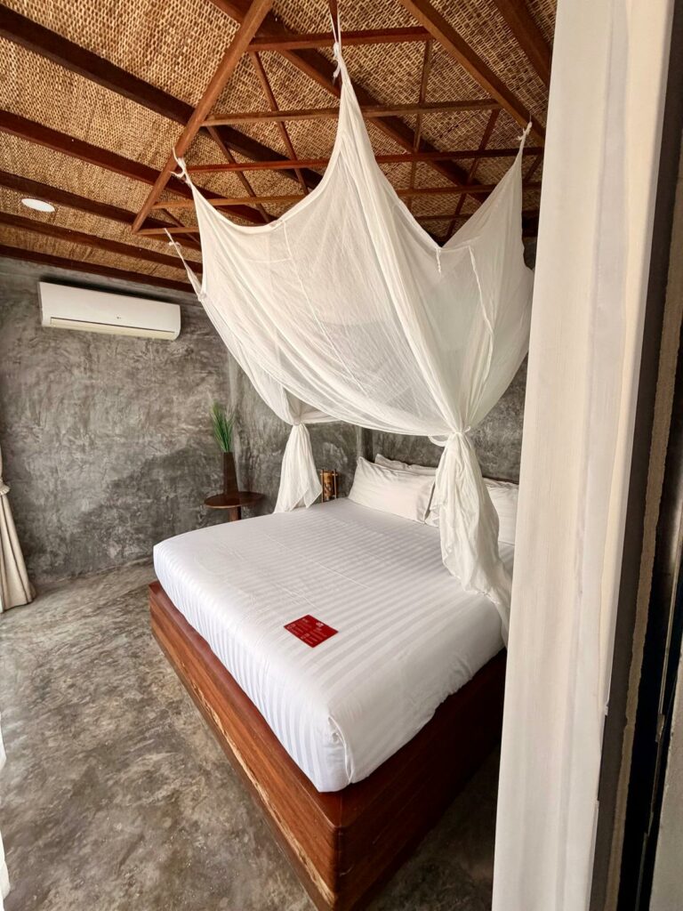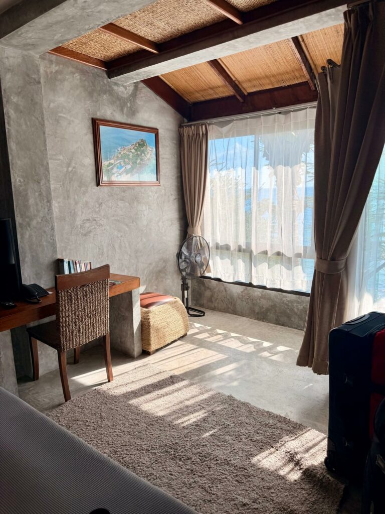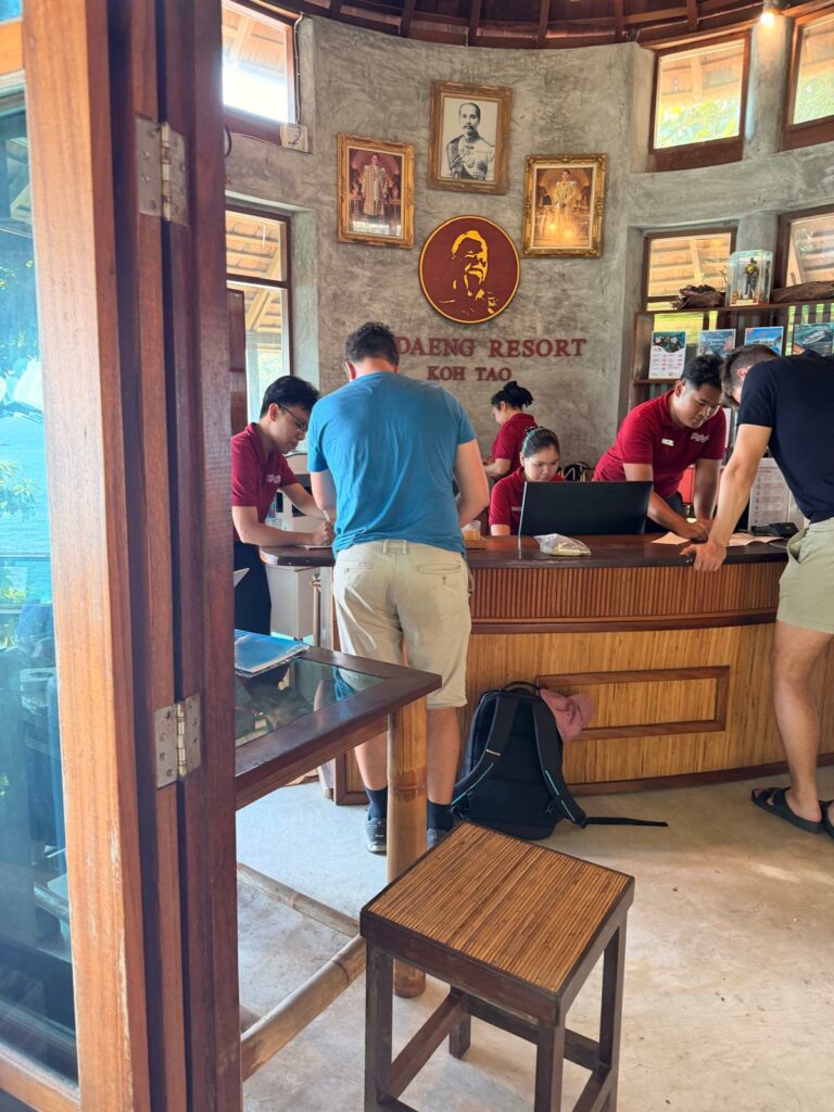 Danach ging es zur Fähre und mit dieser weiter nach Koh Tao. Dank Toms gewohnt guter Planung lief der gesamte Transfer völlig reibungslos, und so kamen wir gegen 15:00 in unserem neuen Zuhause an. Schon von der Rezeption aus war klar: Hier werden wir uns wohlfühlen. Super freundliches Personal, ein wunderschöner Strand, an dem bereits einige Schnorchler im Wasser unterwegs waren, und gleich daneben noch eine zweite kleine Bucht, in der gerade ein Ausflugsboot angelegt hatte. Unser Zimmer liegt perfekt – genau zwischen Pool und Meer. Besser hätte man es kaum treffen können.