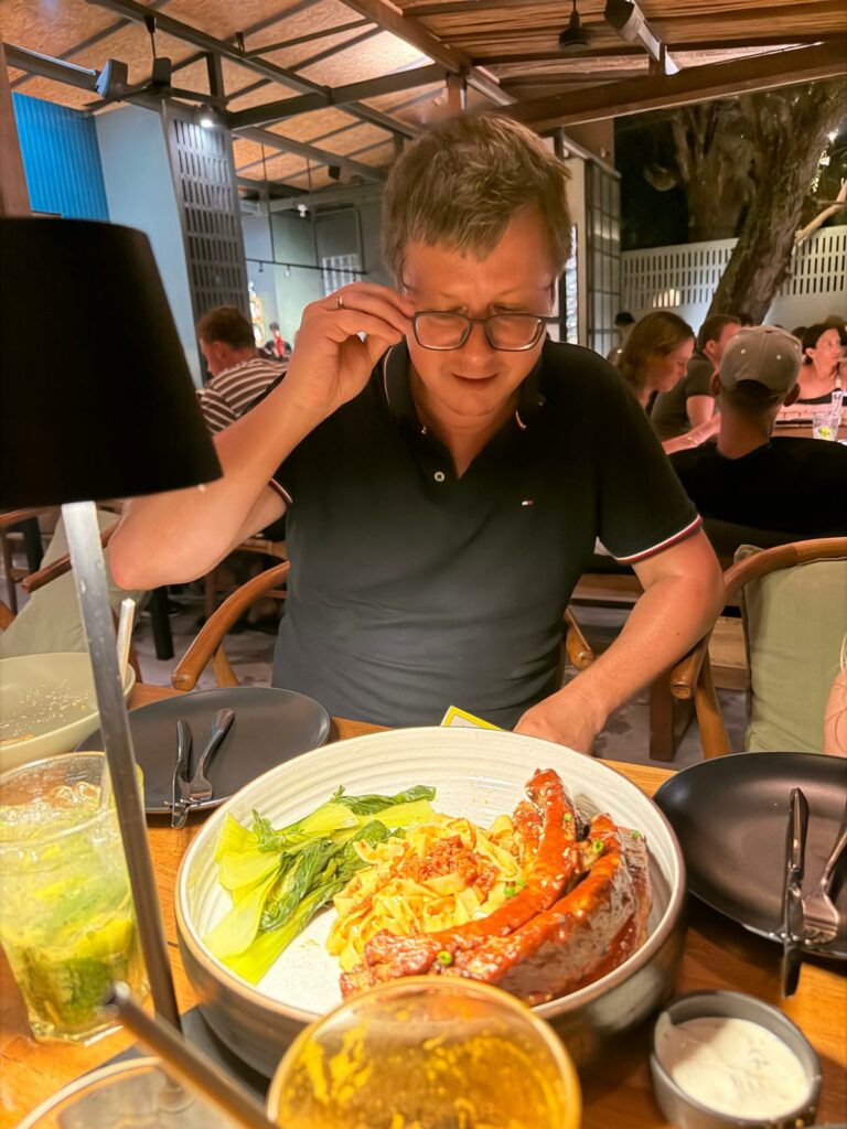 Zu Mittag ging Conny noch mit ihren Tauchkollegen Beate, Petra und Lars essen. Am Abend trafen wir sie nach Poolzeit und Shuttlefahrt nach Sairee Beach wieder. Erneut ging es ins Charcoal Bay Wine & Grill – diesmal mit deutlich geringerer Rechnung, aber genauso zufriedenen Bäuchen.