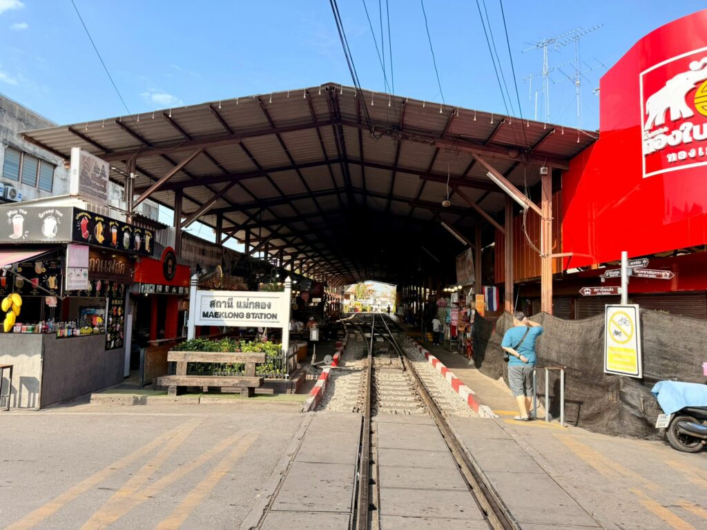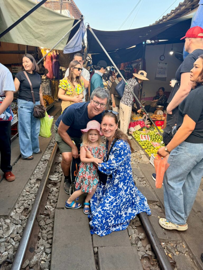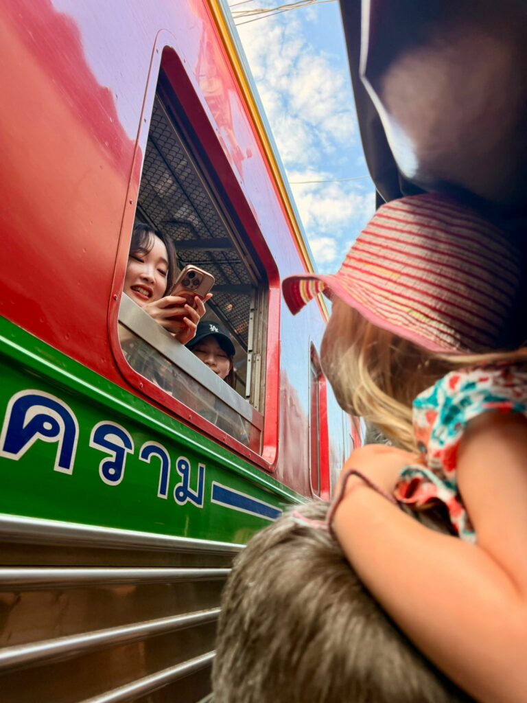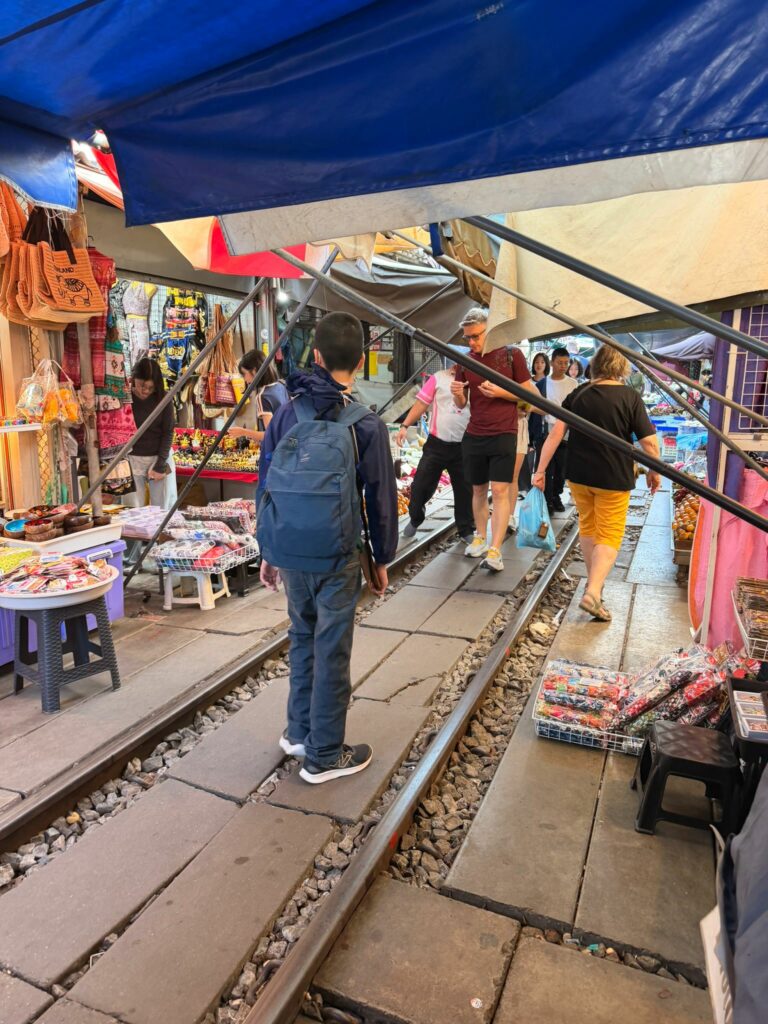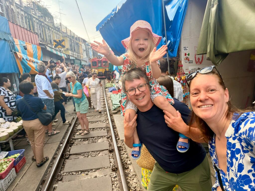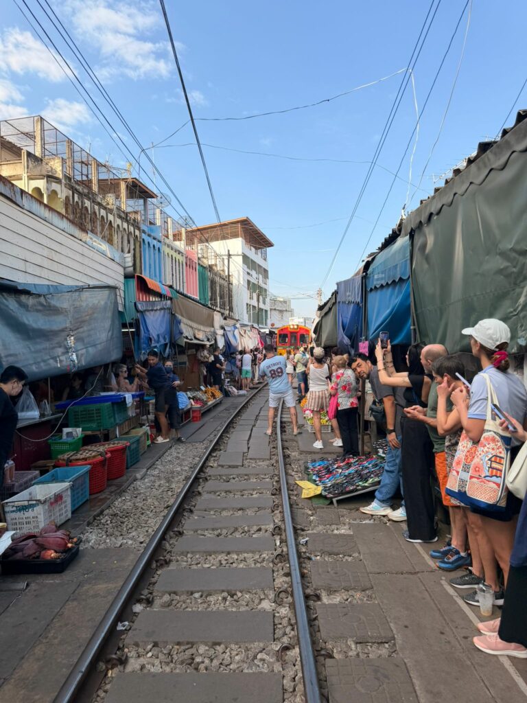 Für heute hatte Tom wieder eine Tour organisiert. Bereits um 06:30 wurden wir vom Hotel abgeholt und über diverse Hinterstraßen zum Train Market gebracht. Dank perfektem Timing unseres Guides hatten wir genau genug Zeit, um uns einen Platz hinter der roten Linie zu sichern. So konnten wir den Zug sicher und aus bester Perspektive beim Durchfahren des Marktes beobachten – ein wirklich beeindruckendes Erlebnis.