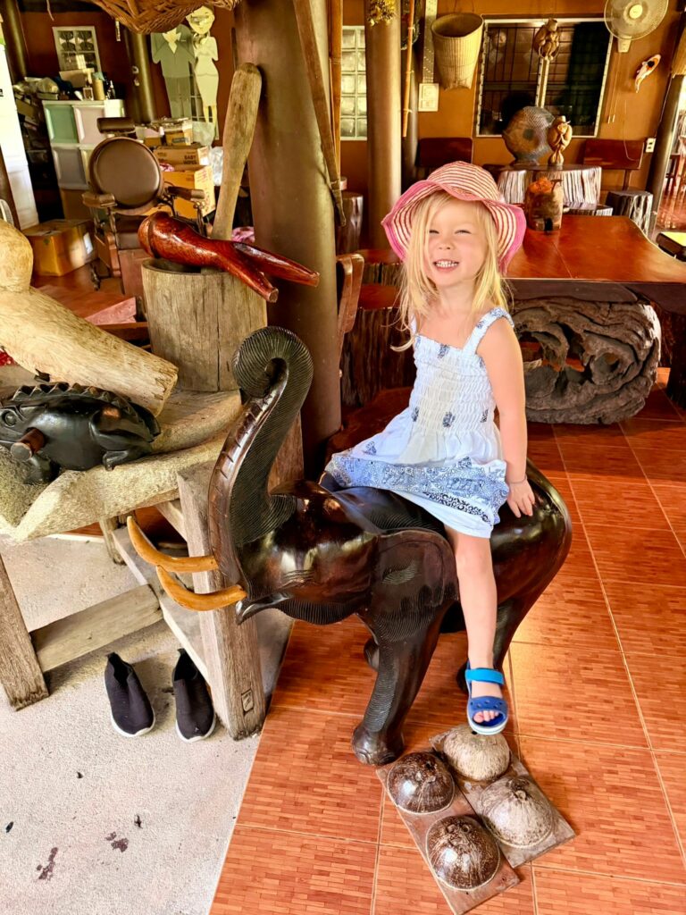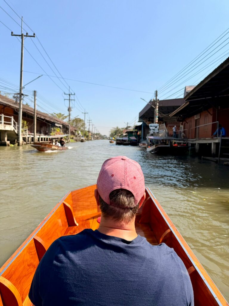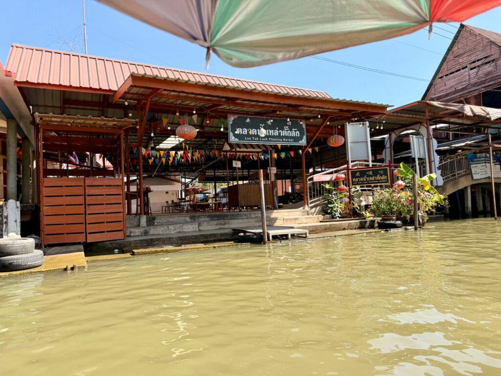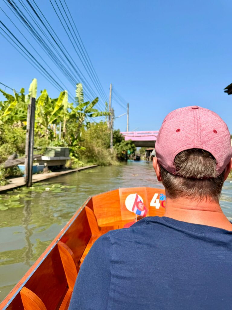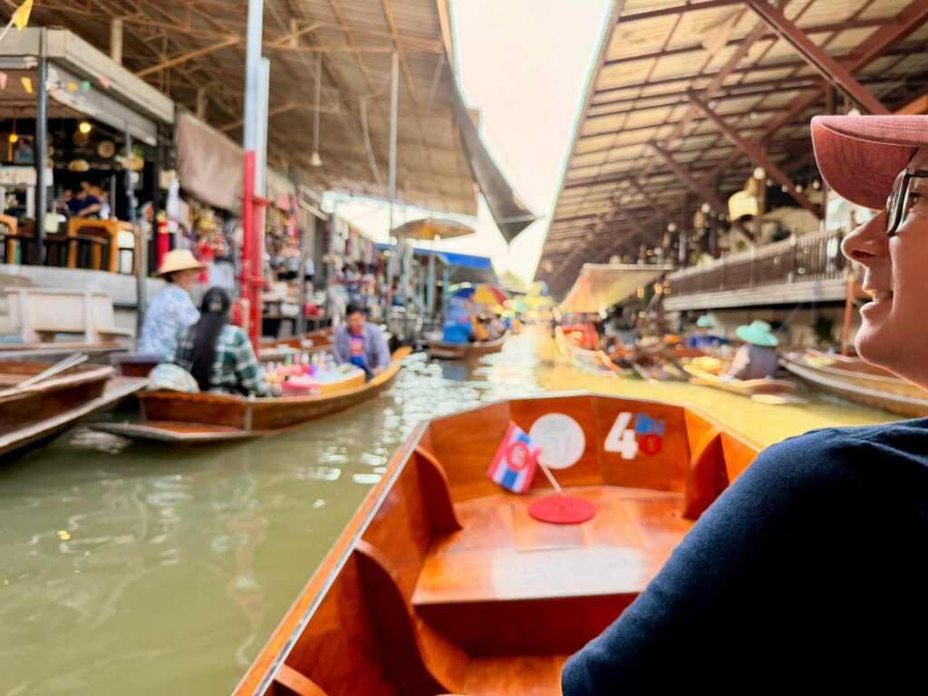 Der dritte und letzte Stopp war der Floating Market. Vom Boot aus konnten wir die vielen Häuser und Stände entlang der Kanäle betrachten. Da unser Guide bereits angekündigt hatte, dass hier alles deutlich teurer ist als am Train Market, waren wir froh, unsere Mitbringsel schon besorgt zu haben. Nach einem authentischen Mittagessen ging es mit viel Stau zurück nach Bangkok. Aufgrund eines Kranunfalls, bei dem vor zwei Wochen 32 Menschen ums Leben gekommen sind, ist eine der Hauptverkehrsadern weiterhin gesperrt. Statt der geplanten zwei Stunden dauerte die Rückfahrt rund dreieinhalb – mit Schwanensee- und Nussknacker-Videos ließ sich das für Emelie aber ganz gut überstehen.